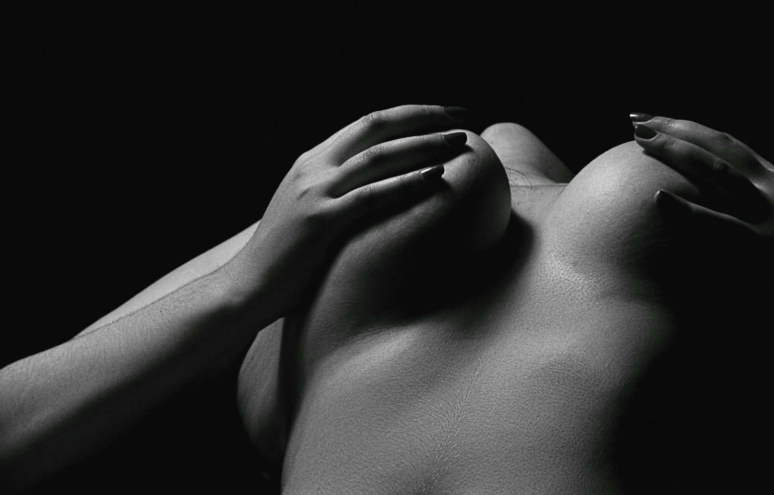 I allow myself to feel and let out a few more moans. His left hand slowly glides across my back. The touches barely graze me. He moves his hand from one side of my lower body to the next. Each side to side I feel the nervous energy leave my body. His hand moves back up, and for a moment, he stops in the middle. He pushes his fingertips into my skin, and I can feel his energy move from him to me–my defenses slowly diffusing. I am watching him as he watches my breaths become more shallow.